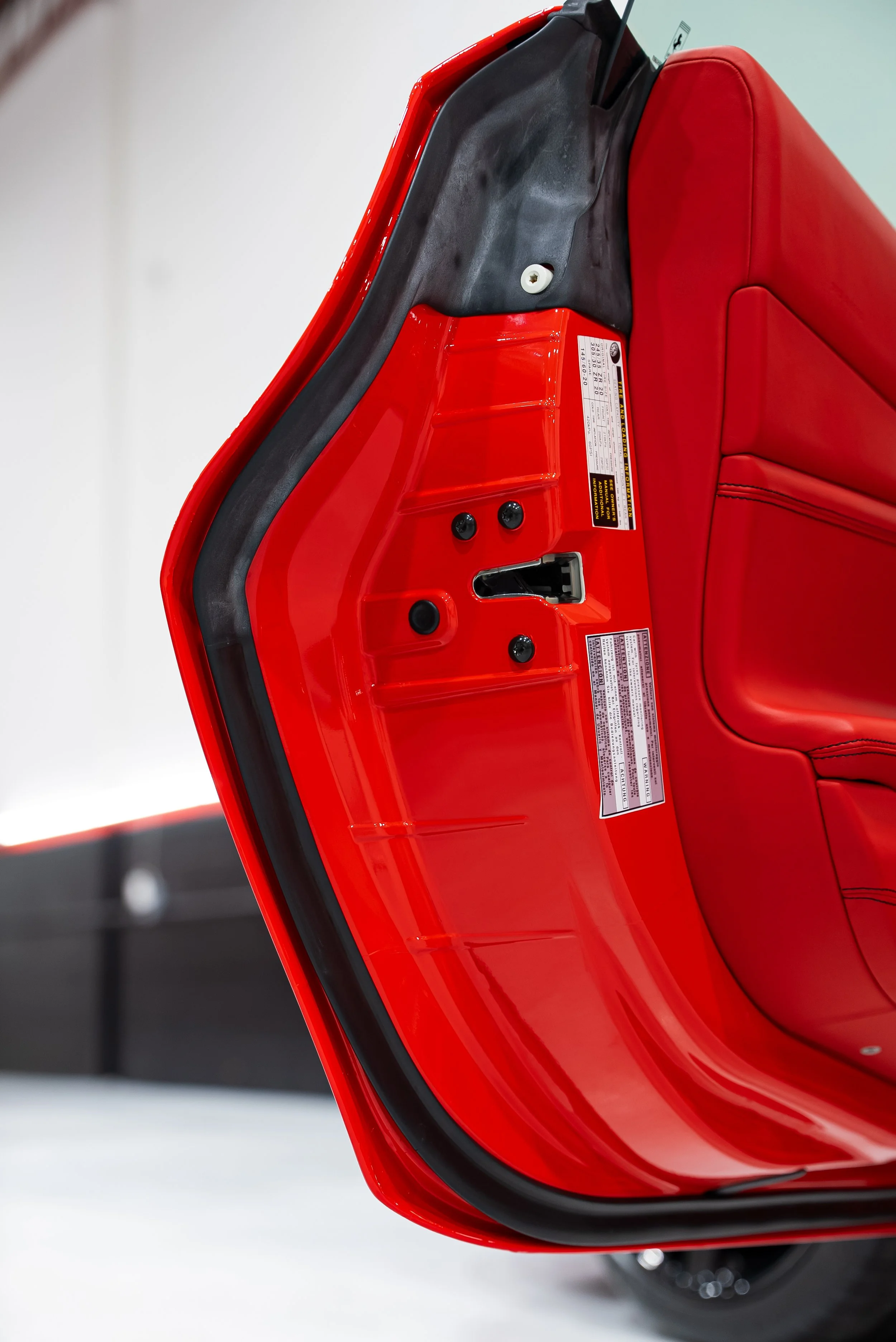 Every crevice and crack of the intricate bumpers were meticulously disassembled and all edges were wrapped so you wouldn’t ever be able to tell the vehicle was previously white. We did the door jambs, door sills and all details where white could show through. In addition to Rosso Corsa, we also used Gloss Black PPF on the mirrors and convertible top for some contrast.